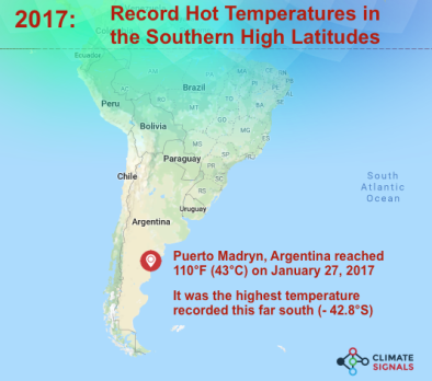- On January 27, Puerto Madryn, Argentina reached 11°F. This was the highest temperature recorded this far south.