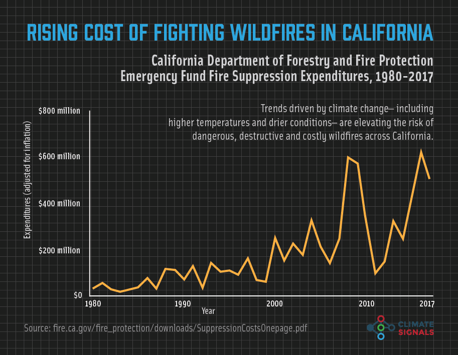 The increase in wildfire activity in California has led to an increase in the amount of money the state must spend each year to suppress wildfires, leaving less money available for fire prevention. In July, California spent more than $114 million fighting 8 fires, including the Mendocino Complex, that continued to burn into August.[7] For comparison, see the infographic below showing the rising annual cost of fighting wildfires in California.