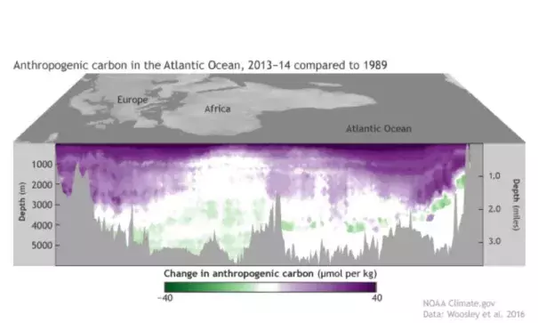 Burning fossil fuels releases carbon dioxide into the atmosphere, and about a third of it winds up being absorbed by the ocean. This uptake slows the impact of carbon dioxide on Earth's temperature, but it comes at the cost of ocean acidification that harms shellfish, coral, and other marine life. According to 2016 research from NOAA and university oceanographers, the amount of fossil-fuel carbon absorbed by the Atlantic Ocean increased significantly between the 1990s and the 2000s, causing surface pH to drop by roughly 0.4% per year.