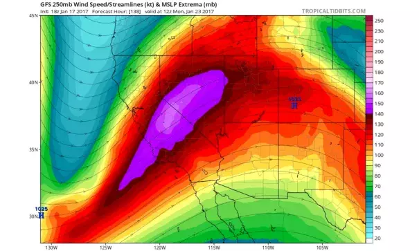 After a couple of bouts of very warm rains, even at very high elevations, the most recent storm systems have been associated with a much colder modified Arctic airmass. The combination of cold temperatures and and an active storm track brought a tremendous amount of snowfall to virtually all mountain areas of northern and central California (at the highest mountain peaks, as much as 10-20 feet of snow!). In some places, especially along the crest of the Sierra Nevada, the last storm in this series brought extreme and crippling blizzard conditions. Parts of the Lake Tahoe region are still digging out after many feet of snow and nearly hurricane-force winds brought widespread disruptions to the power grid and transportation infrastructure.