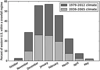 A quantitative summary of historical and projected areal extent of snowfall-conducive temperatures across the entire western U.S. (west of −100° longitude). Future extents are based upon the RCP8.5 scenario using a 20-model GCM mean. (ΔT ranging from ~1.5 to ~4°C spatially).