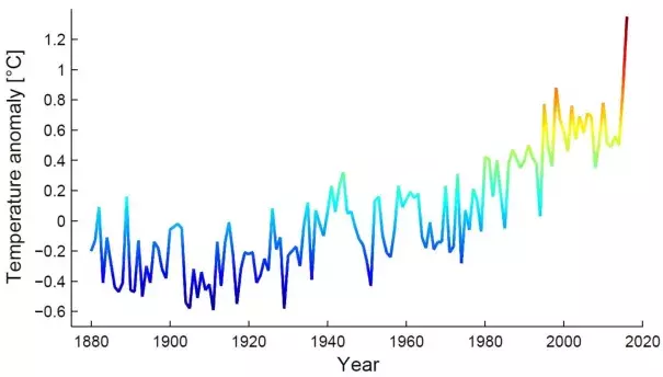 Graph: February's global temperature spike by The Conversation, Stefan Rahmstorf February temperatures from 1880 to 2016 from NASA GISS data. Values are deviations from the base period of 1951-1980. Go to Site