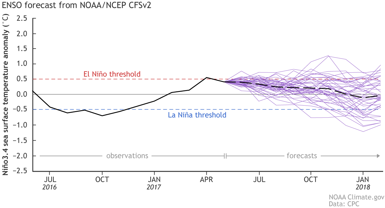 Forecasts of ENSO from the NOAA Climate Forecast System version 2. The solid black line is the observed Niño-3.4 SST data from NCEI. The dashed black line is the average from all the individual forecasts, shown by the purple lines. These forecasts show the spread of different possible outcomes from this model. Values that persist greater than 0.5°C indicate El Niño conditions. Figure provided by Wanqiu Wang (CPC) and modified by Climate.gov.
