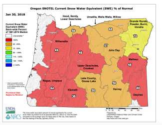 Map: Oregon SNOTEL Current Snow Water Equivalent (SWE) % of Normal, 1/30/18 by NRSC | USDA Go to Site